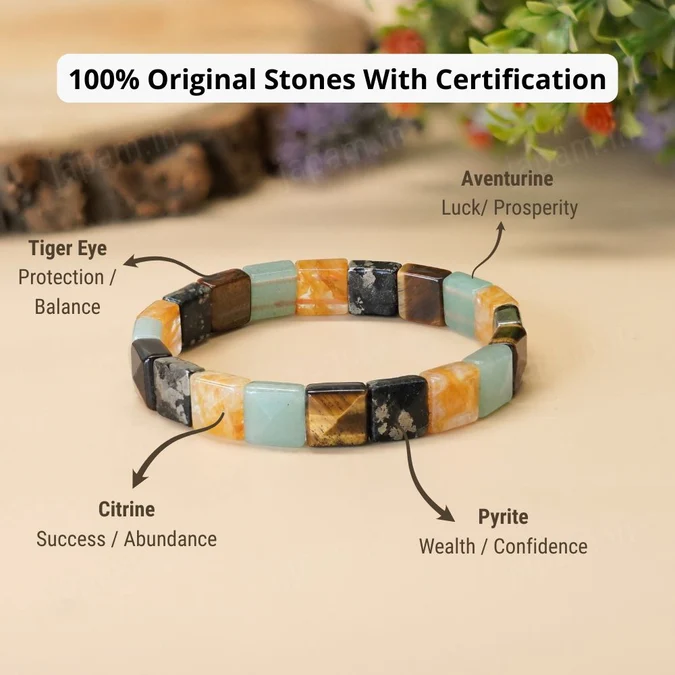 The Money Magnet Cubical Band is designed to attract wealth, success, and prosperity by combining the energies of powerful gemstones. Crafted with Pyrite, Tiger Eye, Citrine, and Green Aventurine beads, this band radiates positivity, financial growth, and confidence.